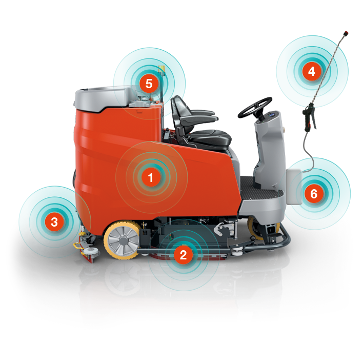 Für kleinere bis mittlere Flächen z. B. in Schulen, Krankenhäusern und Pflegeheimen sowie in Spa/Sauna und Sporthallen: Die Desinfektionsmittellösung wird über den Chemiebehälter mithilfe der Onboard-Chemiedosierung über Bürstenkopf oder Handsprühlanze ausgebracht. Alternativ kann die Desinfektionsmittellösung auch im Frischwassertank angesetzt werden.